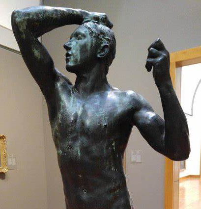 The figure’s eyes are closed, his mouth slightly open. His right hand rests on his head, while the left is raised, as if he is waking from a deep sleep or perhaps shielding himself from something unseen. Originally, the left hand held a spear, but Rodin removed it, stripping the work of any clear narrative or historical reference. Instead, he left us with a universal image: a human being at the moment of awakening, caught between the past and the future, between innocence and knowledge.